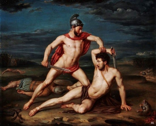 Achilles makes a similar choice. Prompted by the death of his comrade, and lover, Patroclus, Achilles sets off in a fit of rage to slay Patroclus’ killer, prince Hector of Troy.