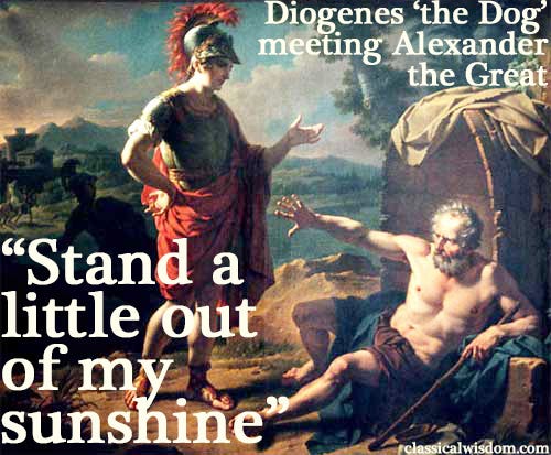 The most famous among the Cynics was a man named Diogenes of Sinope, often referred to as Diogenes the Dog due to his radical behavior, including public defecation. Clearly, he took Cynical philosophy to the extreme. He embraced pain, hardship, and poverty. He lived in a ceramic tub, ate scraps, and gained most of his goods through begging. Diogenes the Dog passed the time by making fun of social convention, and calling attention to the absurdity of robotic-like behavior by those around him (even to the likes of Alexander the Great!)