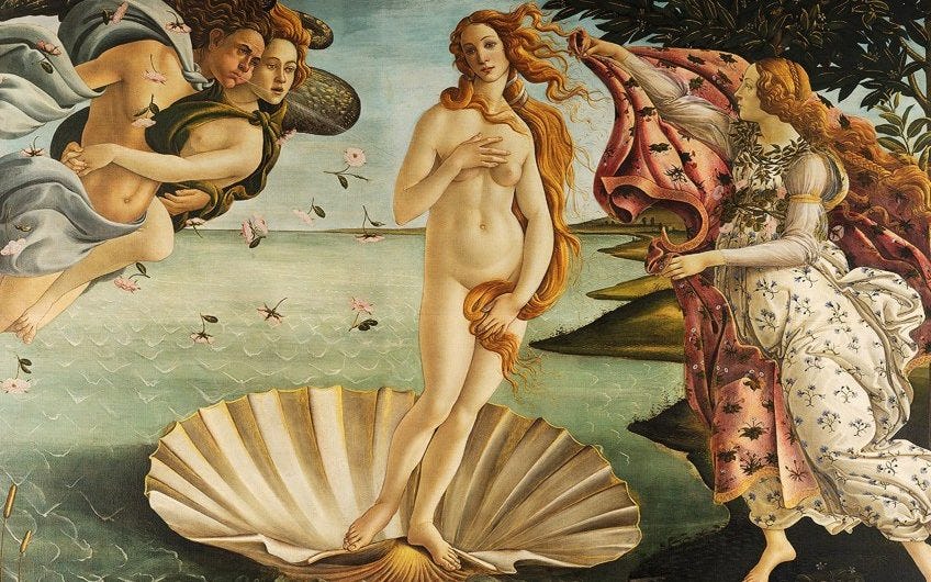 The blood from the detached member of Uranus mixed with the foam of the ocean. From the mist and the foam rose a beautiful figure. She was a goddess unmatched in beauty and grace, she stepped upon the land and the flowers and vegetation grew around her. She was Aphrodite, one of the original Olympians.