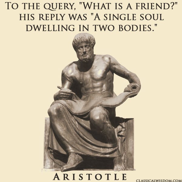 Aristotle categorizes friendships according to their telos: pleasure, utility, or virtue. The first two can be had by nearly anyone. Even fellow thieves can have a “friendship” of utility. Yet such “friendships” are short-lived and end when the mutual advantage ends. Virtuous friendships require virtuous people. They are long lasting because virtue is solid and durable.