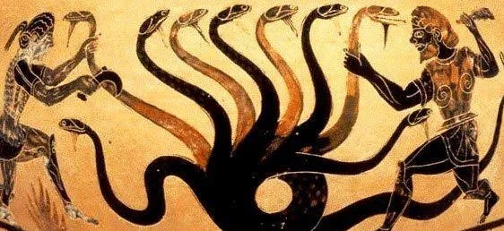 The Hydra is known for being the second monster that Heracles encounters during his twelve labors. Before attacking the Hydra, Heracles covers his mouth and nose with cloth so that he will remain safe from the deadly toxins the monster emits from it’s many mouths. Heracles originally attacks the Hydra with either a sickle, a sword, or his trademark club. However the hero quickly realizes that for every head decapitated, the creature quickly grows two more. The battle would appear hopeless.