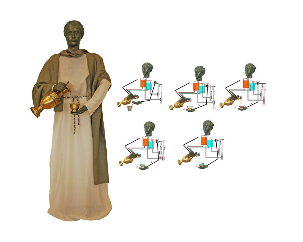 They also invented mechanical alarms, such as a bell that rang when a door was opened, serving as an early form of security system. Among their most astonishing creations were: