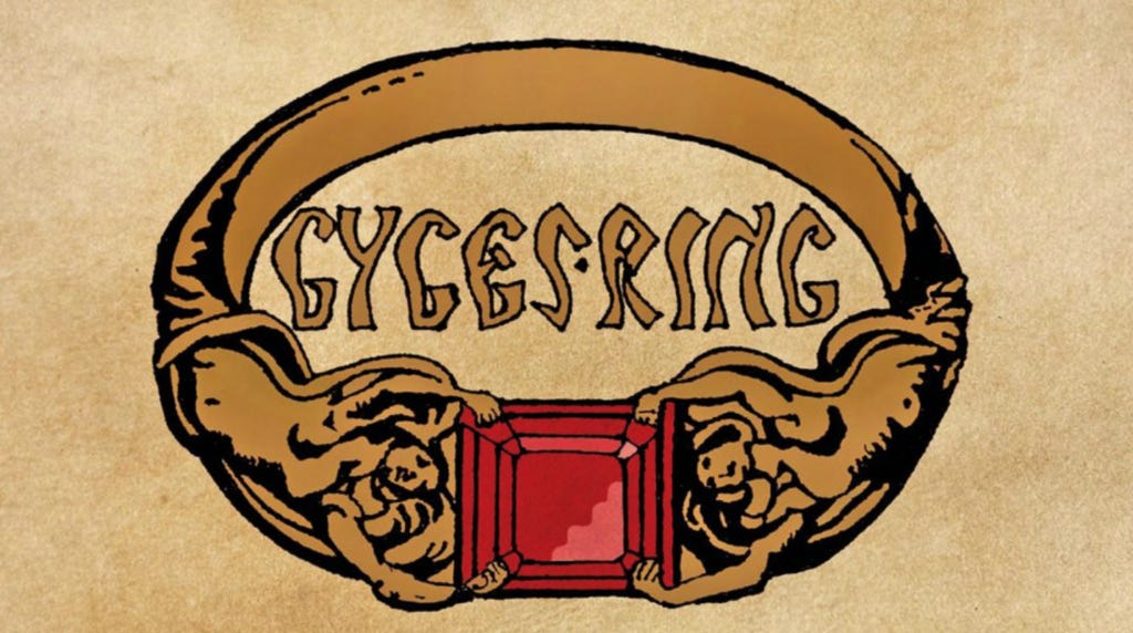 The ring story that may bear the closest resemblance to Tolkien’s is of more ancient origin: the tale of Gyges, which occurs in Book II of Plato’s Republic. In it, Glaucon tells the story of Gyges’ ring, which depicts a man free from the necessity to be just, i.e., free from the fear of punishment. Such a man, he argues, would be foolish if he continued to act in a just manner when he could have anything he wants. The ring allows him to fulfill his desires because it can render its wearer invisible. It is the ability to pass unseen that provides the fulcrum for the examination of justice in Plato’s story.