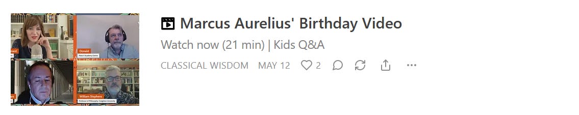 We have a special highlight from our recent celebrations of Marcus Aurelius’ birthday. In collaboration with Plato’s Academy Centre, we got questions from children about the Roman emperor and philosopher for a panel of experts to answer. The questions we got were priceless: by turns hilarious and disarmingly thoughtful!