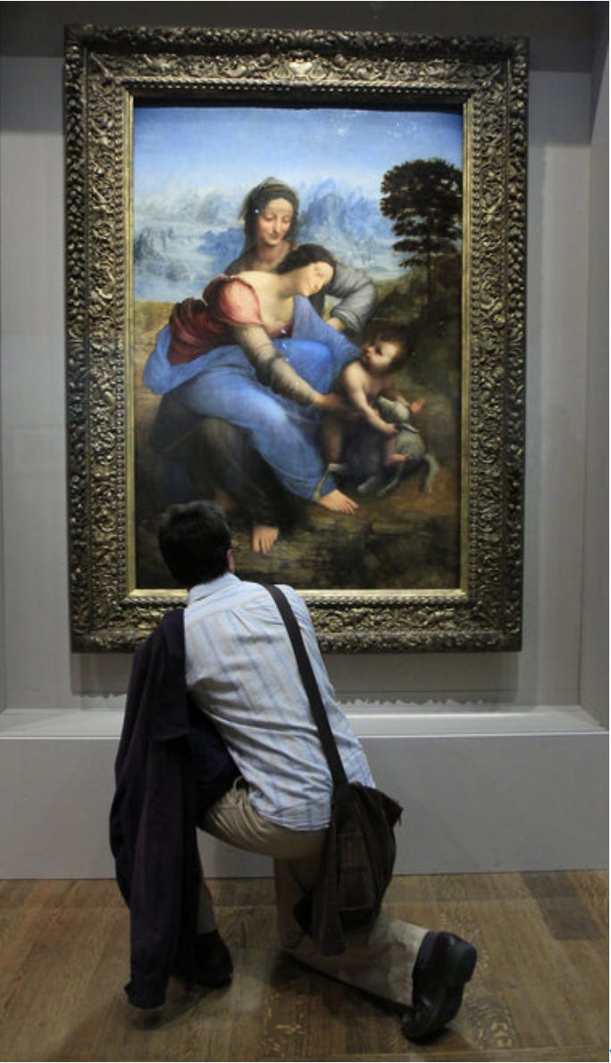 Of course, if you turn the corner... you are face to face, sans the masses, with not only one - BUT THREE - majestic Da Vinci’s. The gentle curves of the Virgin and child, along with St. Anne, captivate and La Belle Ferronnière stares out sternly. Meanwhile, St. John the Baptist, with his gorgeous glowing cheekbones, laughingly points up. For the passionate art lover, it’s a moment to enjoy true beauty... all to one’s self...